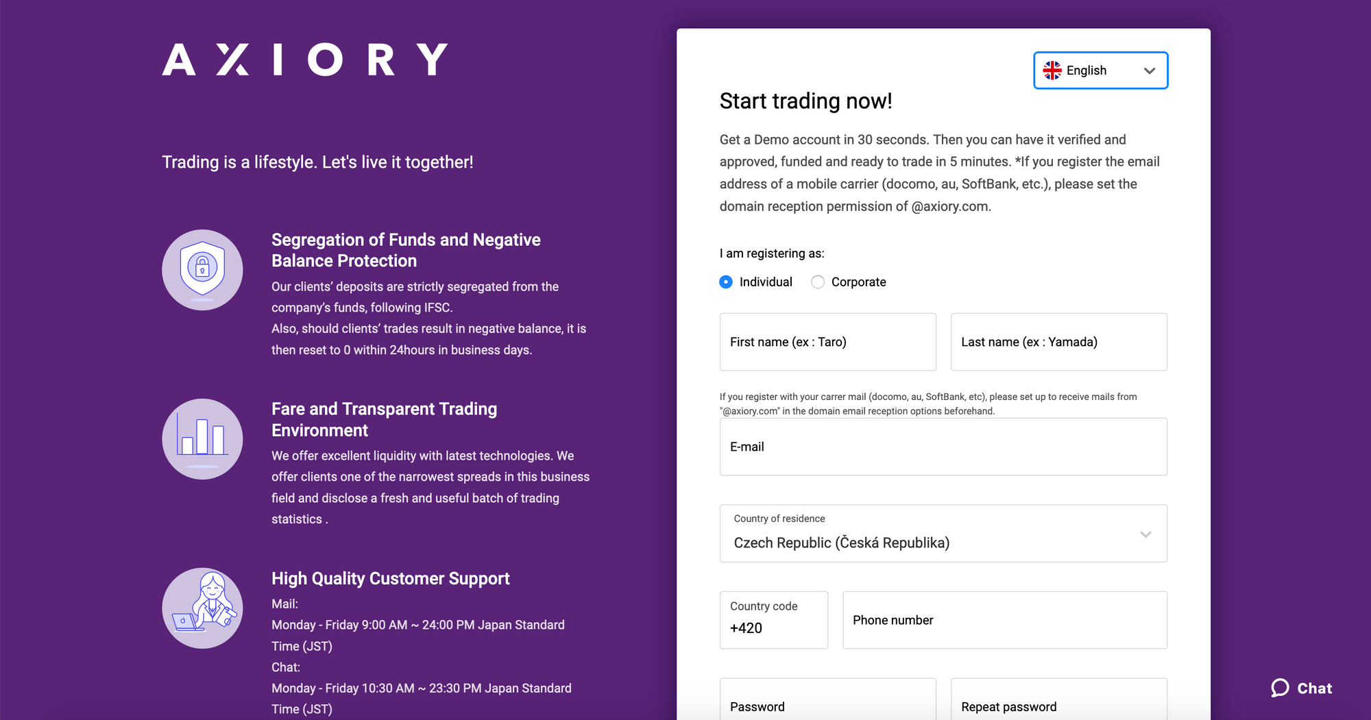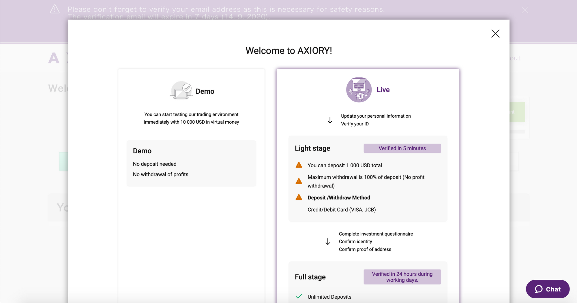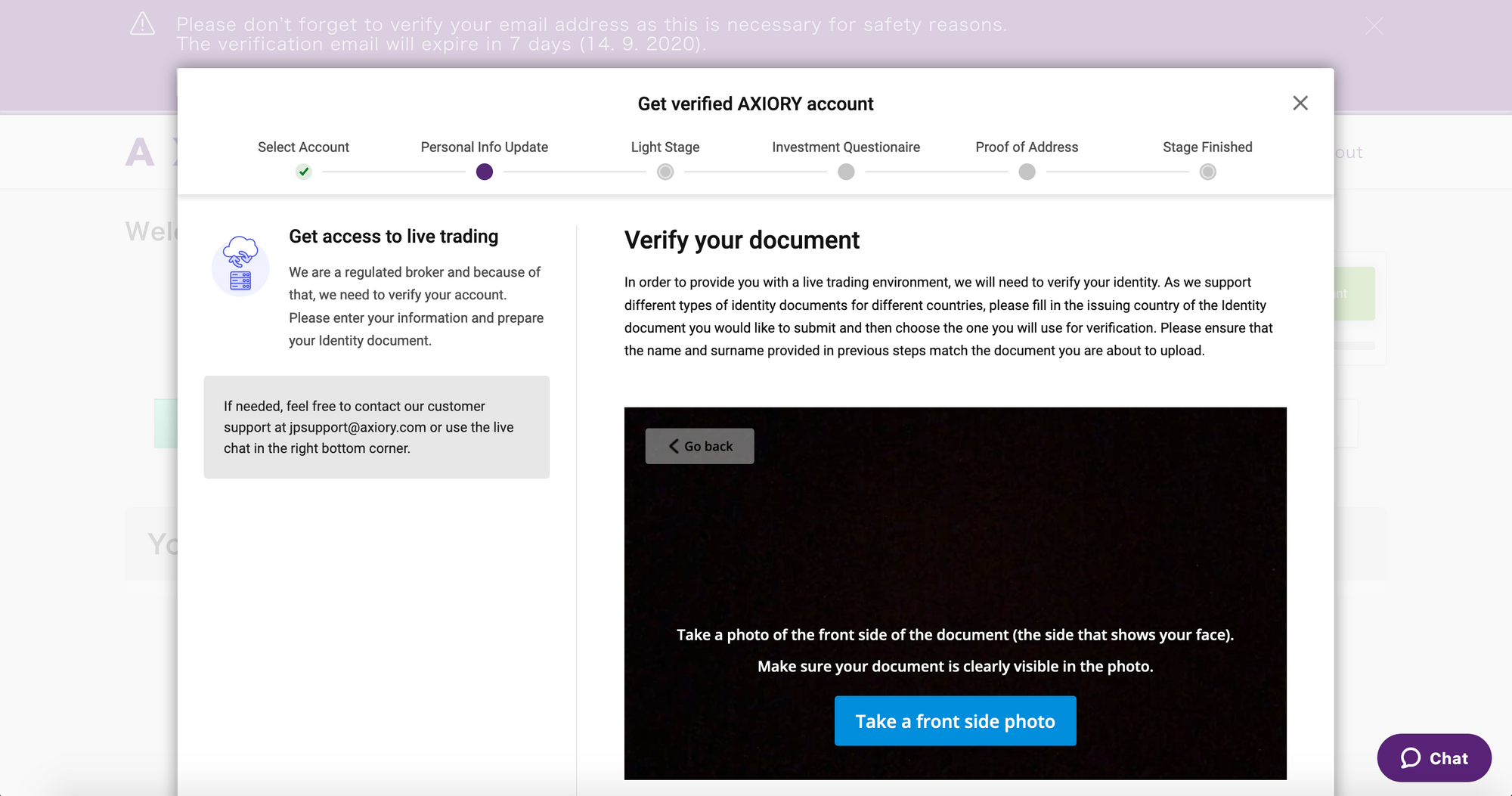 Onboarding pozostáva z 3 častí. Po jednoduchej registrácií získa klient prístup do zóny a k demo účtom. V ďalšom kroku dosiahne na limitovaný live úče a napokon plnohodnotný tradingový účet, kde požadujeme napríklad i overenie klientovho preukazu totožnosti a selfie pomocou webkamery, či vyplniť investičný dotazník alebo nahrať potvrdenie o rezidenčnej adrese.