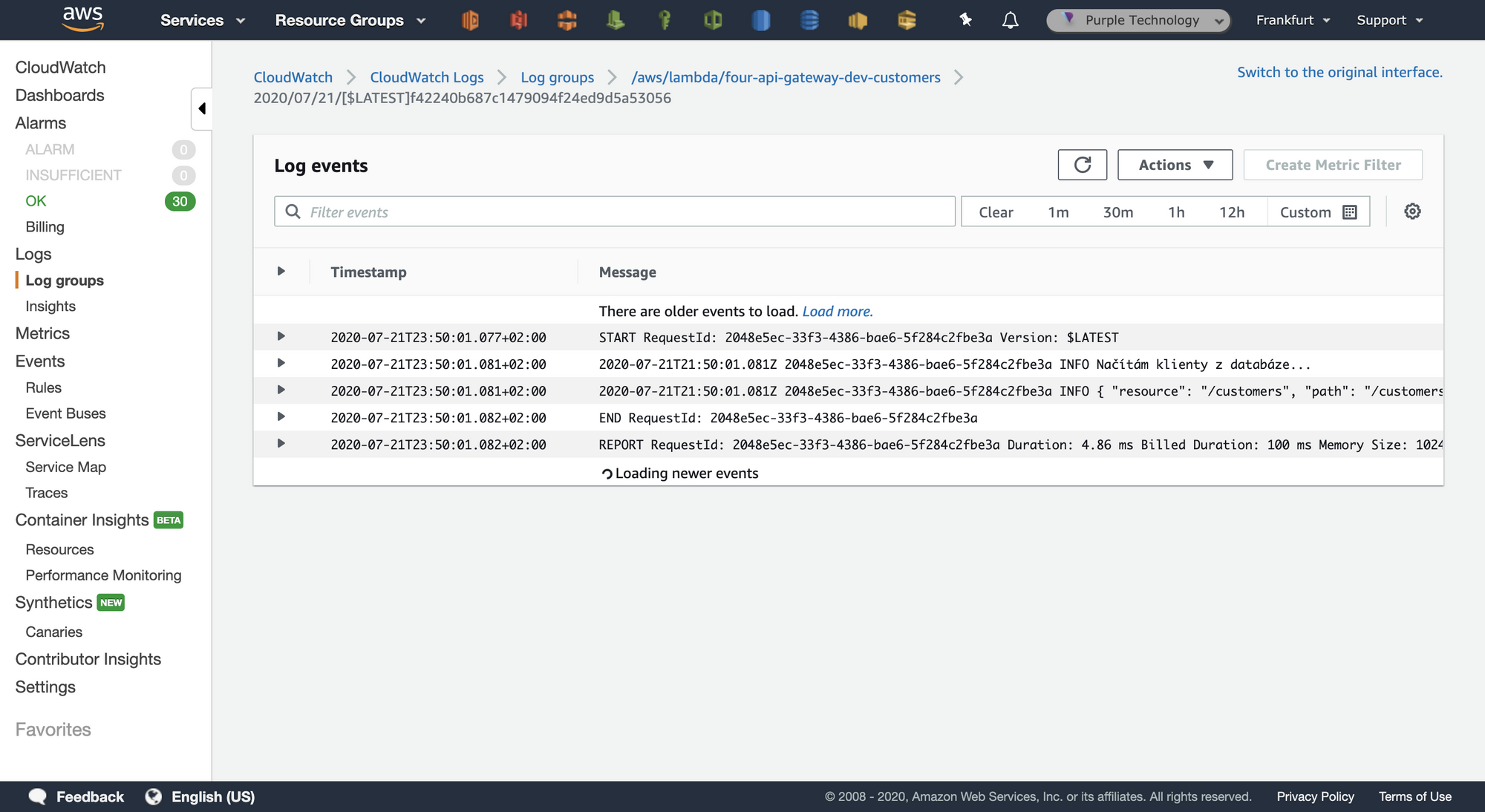 The logs from the “customers” Lambda are available in Amazon CloudWatch, in the log group called: /aws/lambda/four-api-gateway-dev-customers